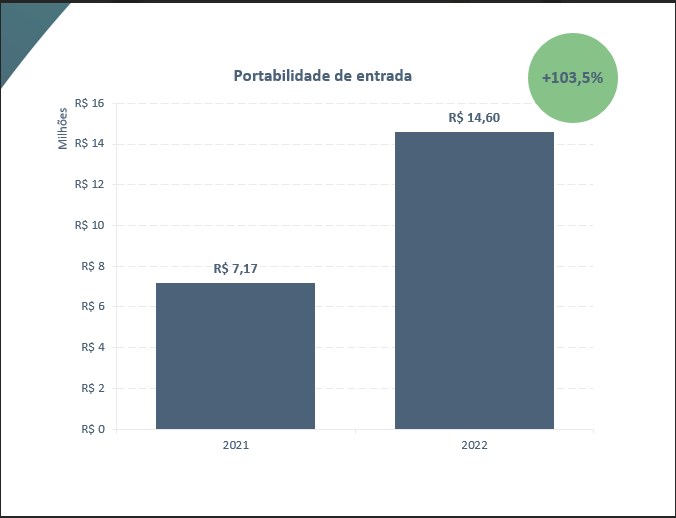 O crescimento no valor das portabilidades de entrada, no comparativo dos anos de 2021 e 2022, foi de 103,5%. Em 2021, o montante foi de R$ 7,17 milhões, enquanto, em 2022, a portabilidade fechou com a cifra recorde de R$ 14,6 milhões.