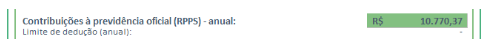 No campo “Contribuições à previdência oficial (RPPS)”, você deve inserir o valor total descontado, no contracheque, na rubrica PSS ao longo do ano. Neste exemplo, vamos supor que o valor total corresponde a R$ 10.770,37.