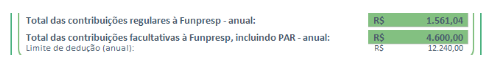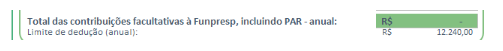 Neste campo, o valor depende de dois fatores: se você já fez contribuições facultativas à Funpresp em 2022 e se você tem a Parcela Adicional de Risco (PAR) contratada.