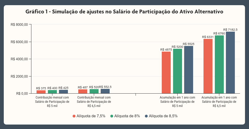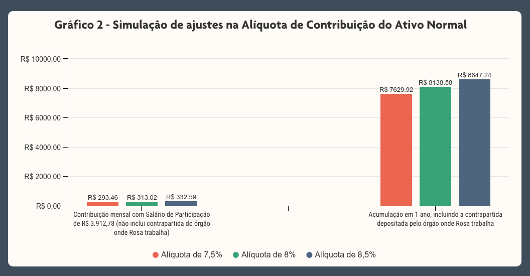 A simulação acima não leva em consideração: a rentabilidade dos investimentos feitos pela Fundação; a parte destinada ao Fundo Coletivo de Benefícios Extraordinários (FCBE); e a taxa de carregamento. O resultado após um ano de acumulação leva em conta a contribuição sobre o 13º salário.