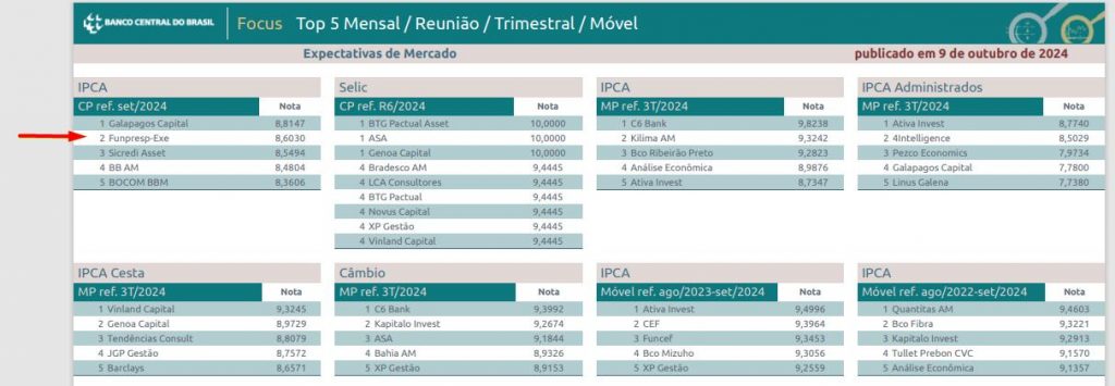 Segue Ranking Top 5 Mensal da Focus, divulgado em 9 de outubro de 2024: