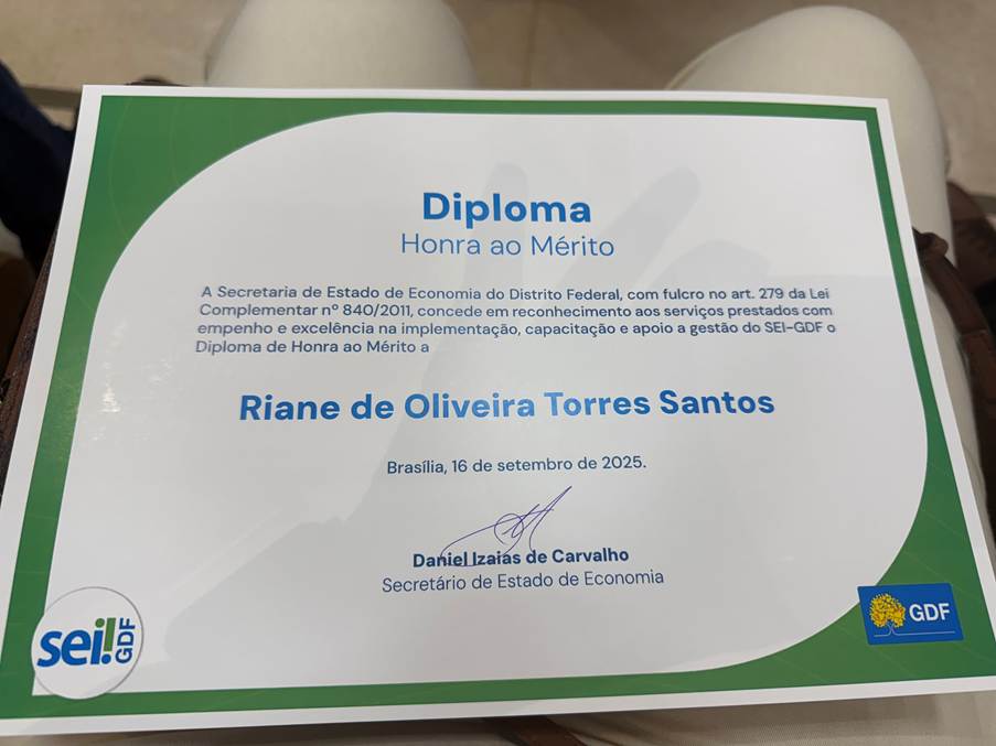 A Coordenadora de Processos e Governança de TI da Funpresp-Exe, Riane de Oliveira Torres Santos, foi uma das servidoras homenageadas pelo Governo do Distrito Federal (GDF), nesta terça-feira, dia 16 de setembro, por atuar na implementação, capacitação e apoio à gestão do Sistema Eletrônico de Informações (SEI-GDF) que completou 10 anos de uso na administração pública.