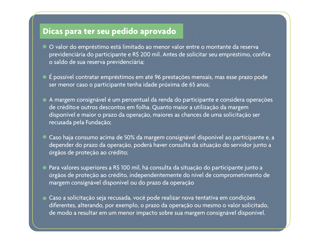 O empréstimo pode ser simulado e contratado pela Sala do Participante ou pelo aplicativo da Funpresp para Android ou iOS. Lembre-se que, antes de fazer a solicitação, é necessário autorizar a Fundação como consignatária por meio do Sigepe ou do SouGOV.br. Após a solicitação, a Funpresp realizará análise de crédito e, em caso positivo, liberará os recursos em até dois dias úteis. Você pode conferir o passo a passo da solicitação de empréstimo, bem como taxas e prazos, na página especial sobre o tema. Se tiver alguma dúvida, é só entrar em contato pelo telefone 0800 282 6794 e, ainda, pelo Fale Conosco.