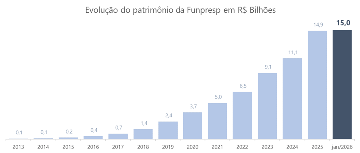 Desde o início de suas operações, em 2013, a Funpresp apresenta trajetória de expansão. O crescimento do patrimônio sob gestão demonstra a consolidação da entidade no mercado de previdência privada: