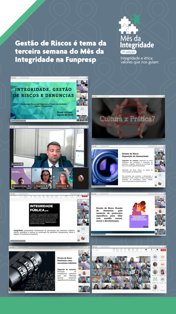 O Mês da Integridade é uma iniciativa prevista no Plano de Integridade 2024-2025, documento que formaliza ações do Programa de Integridade da Funpresp-Exe, e visa conscientizar e capacitar a equipe da Fundação sobre ética, transparência e boas práticas. Em sua 3ª edição, o evento deste ano conta com palestras semanais durante todo o mês de agosto. O próximo tema será “Segurança da Informação”. Os temas das primeira e segunda palestras foram: “Ética e Integridade” e “Proteção de Dados”.