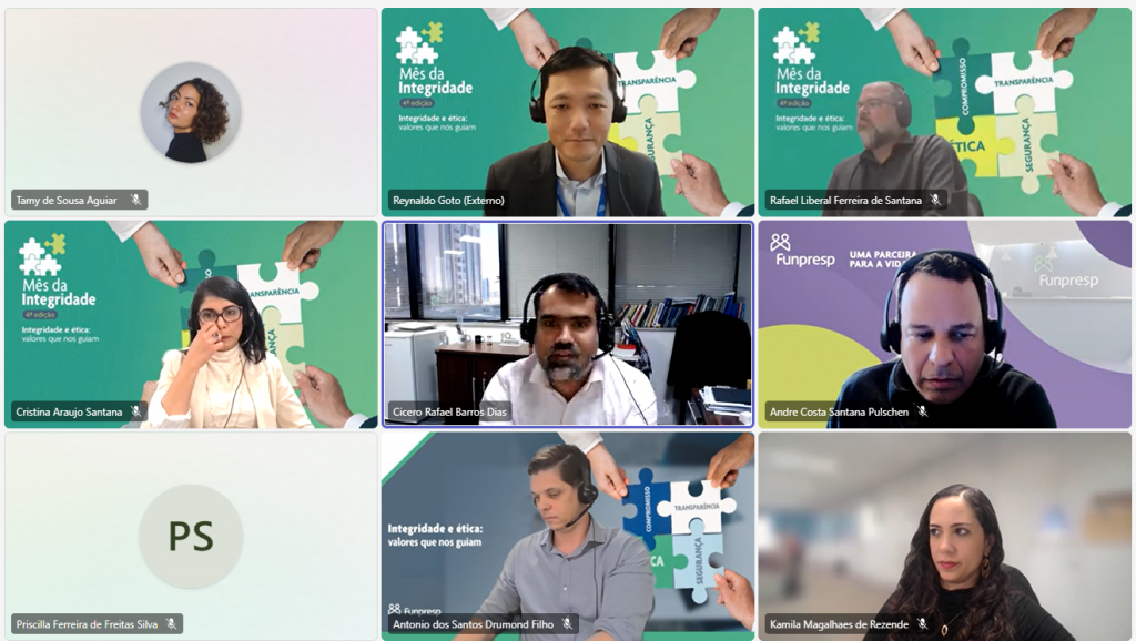 Nessa terça-feira (26/08), a Funpresp iniciou as atividades da 4ª edição do Mês da Integridade, iniciativa que reforça a cultura da ética, da proteção de dados, do gerenciamento de riscos e da segurança da informação dentro da instituição. A abertura ocorreu com a palestra do diretor de Compliance da BRF, Reynaldo Goto, sobre Ética e Integridade. O encontro foi realizado de maneira online e reuniu 122 colaboradores em um momento de reflexão e aprendizado sobre valores num contexto corporativo.