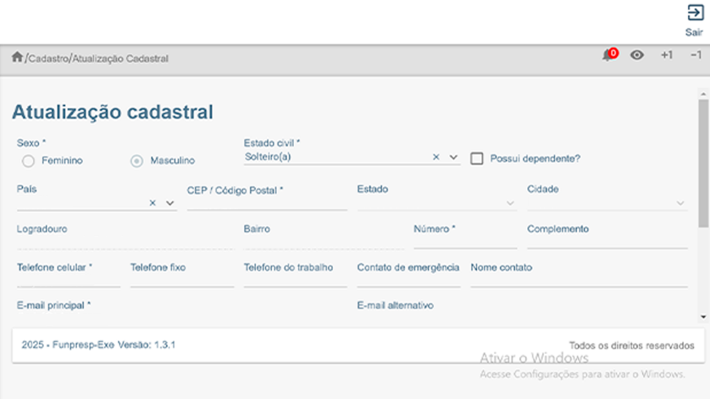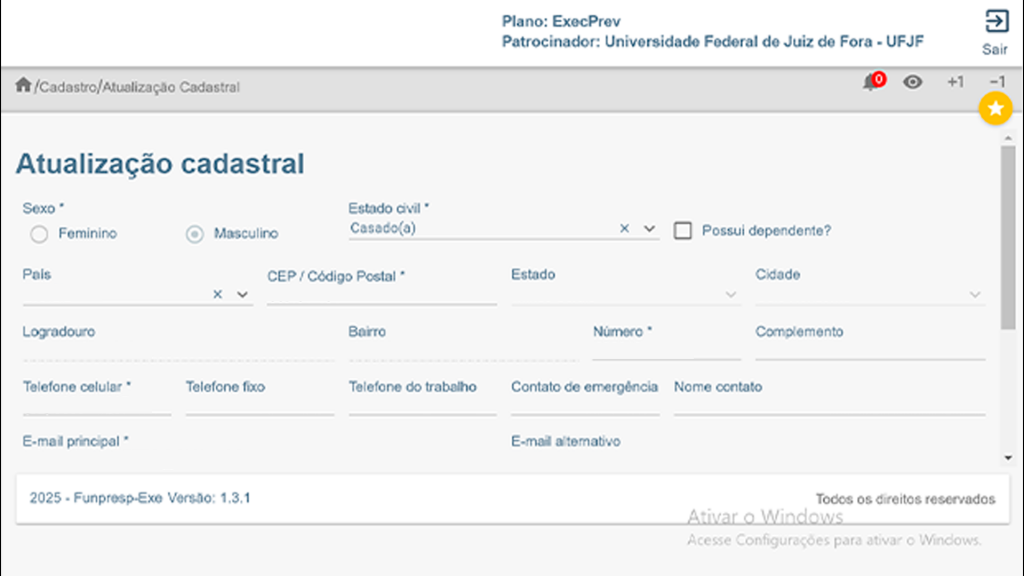 Os aposentados e pensionistas também podem cadastrar um contato de emergência acessando a opção “Atualização Cadastral” no menu à esquerda e preenchendo os campos correspondentes.
