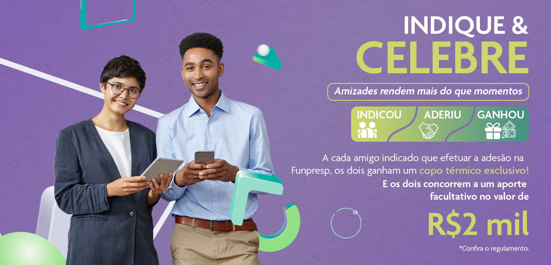 A “Indique e Celebre” é uma campanha realizada pela Funpresp em que o participante da Fundação indica um amigo elegível para aderir a um dos nossos planos de previdência complementar e recebe, em troca, um brinde individual (um copo térmico) após a adesão. Além do brinde, ao final da campanha, os três participantes que trouxerem o maior número de adesões concretizadas por meio das indicações receberão, cada um, um aporte facultativo na Reserva Acumulada Suplementar da Funpresp, no valor de R$ 2.000,00 (dois mil reais). Todos os servidores indicados que aderirem a um dos planos por meio da campanha participarão de sorteio de três aportes facultativos no valor de R$ 2.000,00 (dois mil reais) também na Reserva Acumulada Suplementar da Funpresp. Serão três sorteados, cada um receberá um aporte.